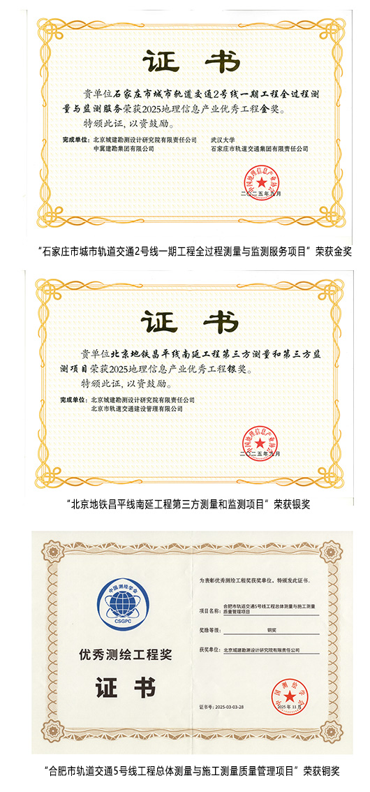在2025年度地理信息产业优秀工程评选中,我院申报的项目凭借高标准的技术创新方案与应用价值突出的成果,从全国数百个参评项目中脱颖而出,斩获多项大奖。其中,“石家庄市城市轨道交通2号线一期工程全过程测量与监测服务项目”荣获金奖;“北京地铁昌平线南延工程第三方测量和监测项目”荣获银奖;“合肥市轨道交通5号线工程总体测量与施工测量质量管理项目”荣获铜奖。